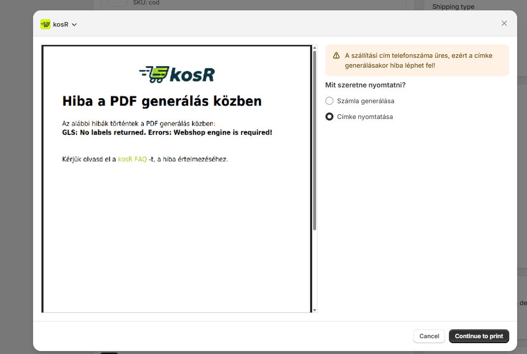 Amennyiben mégsem sikerül kinyomtatni a címkét a myGLS felületén hozd létre. A jövőben ilyen problémád nem lesz, hiszen a Shopify most már jól an beállítva