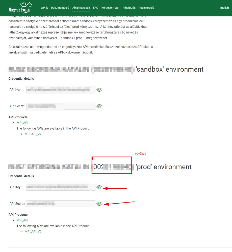 A https://devportal.posta.hu/devapps oldalra bejelentkezve taláhatóak meg az alábbi adatok, amelyek az MPL beállításhoz szükségesek.